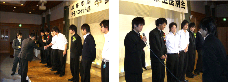 | 3月2日ブケ東海沼津にて、バスケ部19期生の送別会が行なわれました。3年間の苦しかった日もここいる仲間がいたからこそ、たのしいバスケができた、熱いチームでした。 |